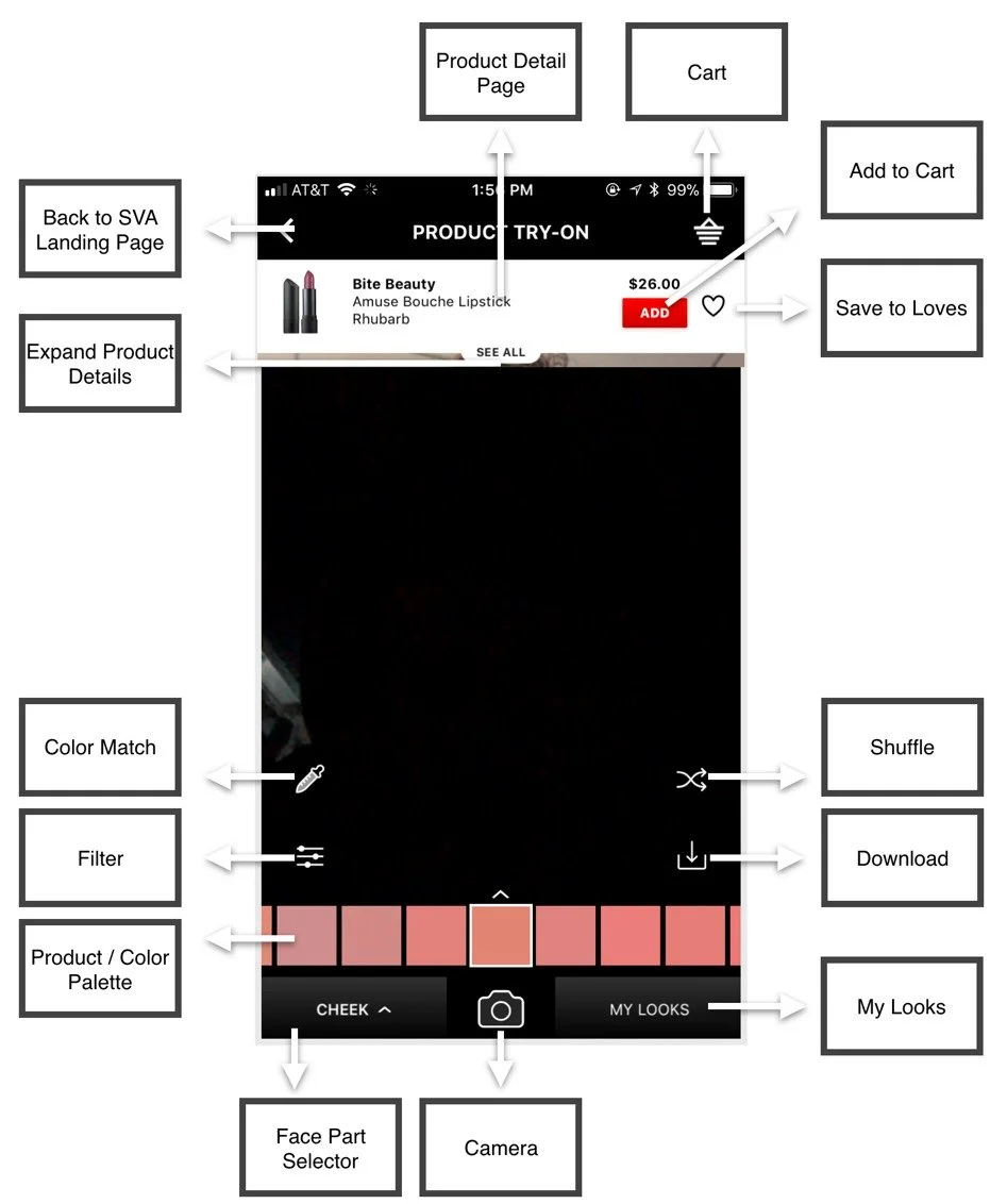 Since the product try on experience was the bread and butter to this app. I started the discovery processed here. Immediately my attention went directly to the visual cacophony of controls - they were static and taking up prime real estate on majority of the screens.